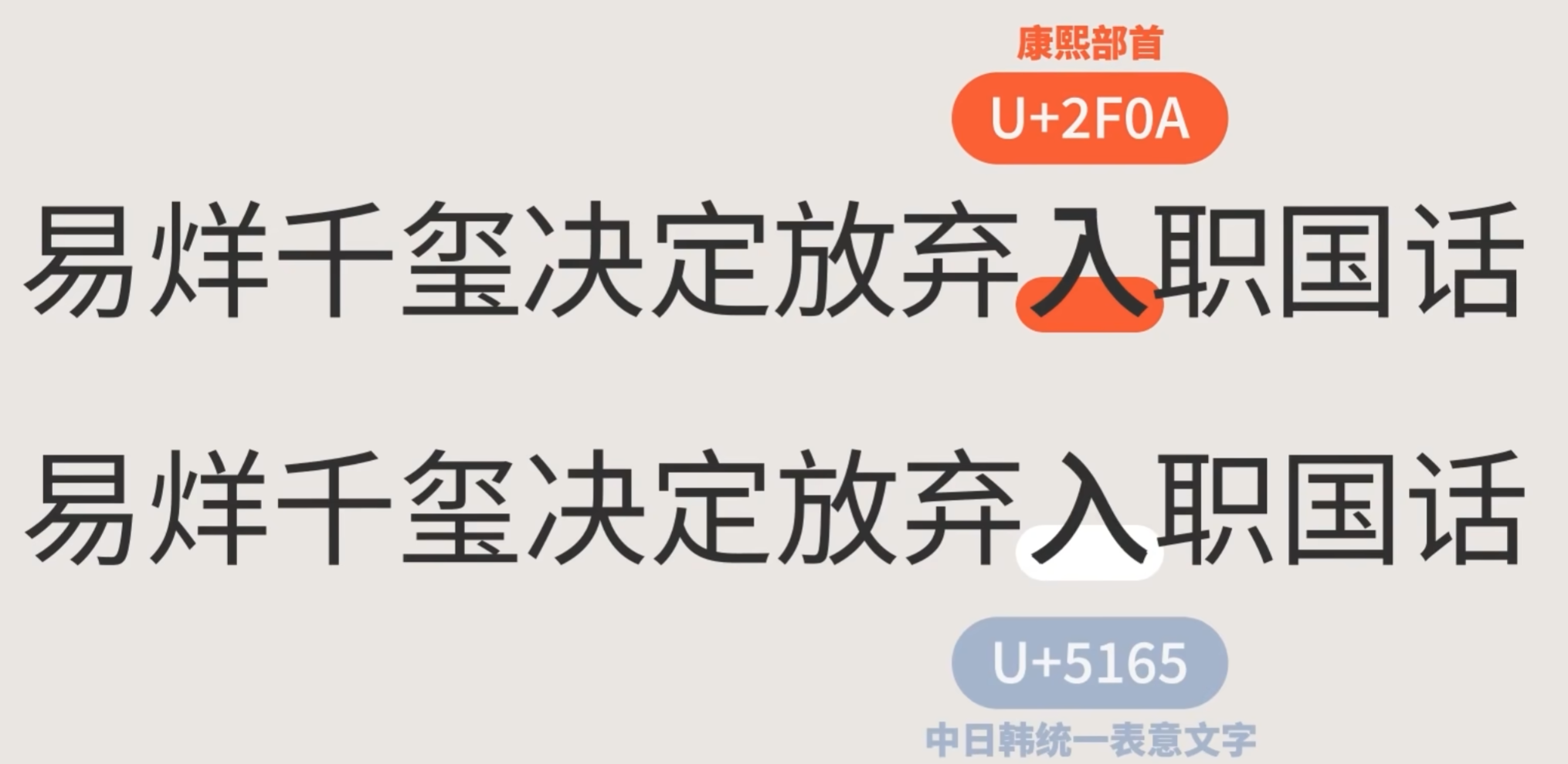 - 中日韩统一表意文字:简繁体字、日本汉字、朝鲜汉字等,为了节省码位,Unicode就让相似的字共用一个码位