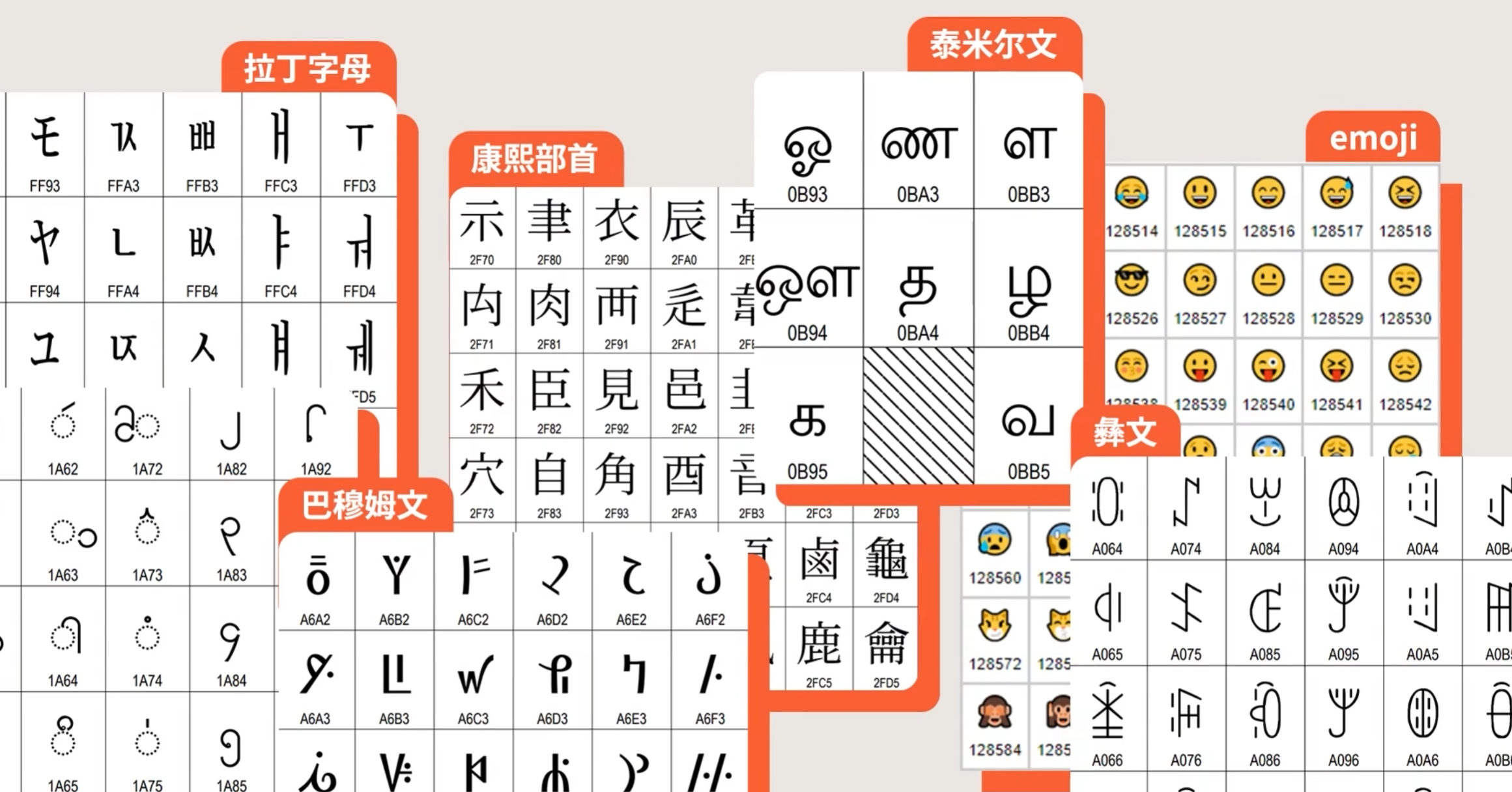 以书写系统为标准,对字符进行分类和收录: